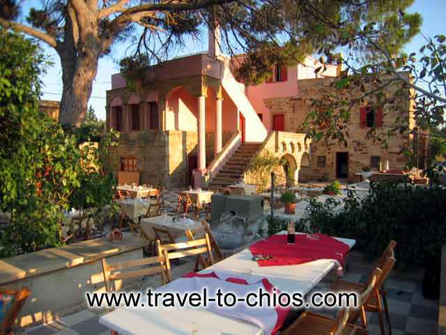 Here, where the deep green of the orchard blends harmoniously with the reddish - beige of the stone... Here, where Nature's beauty warmly embraces the traditional mansion of an earthly master... Here at Kambos, Chios... Here at the Mavrokordatiko Restaurant Cafeteria Guest house with 9 first class rooms All rooms have TV, mini bar, telephone, radio, clock, and fax (upon request)